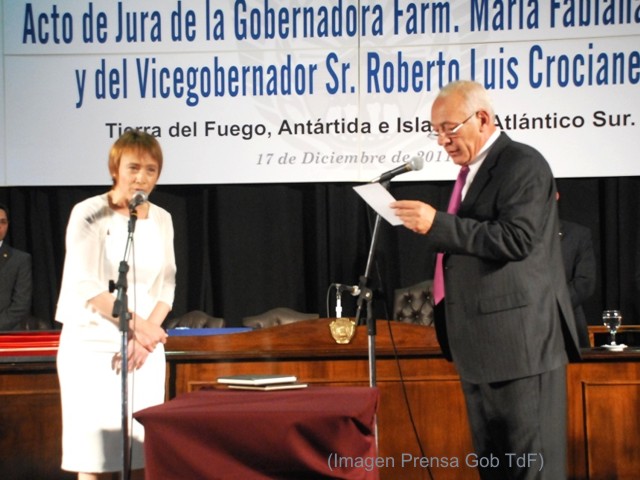 La Gobernadora de Tierra del Fuego reelecta juró en el cargo junto a su vice, Roberto Croccianelli. Durante su discurso, se dirigió con insistencia al grupo de estatales que protestaban dentro del recinto donde se celebró la ceremonia.
