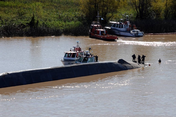 La nave, de 15 metros de manga (ancho), quedó recostada sobre el lecho del río en un lugar donde la profundidad es de doce metros, por lo que exhibe su lateral izquierdo sobre la superficie.