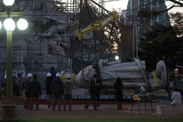 Pese a la prohibición judicial, sacaron el monumento a Colón en Capital