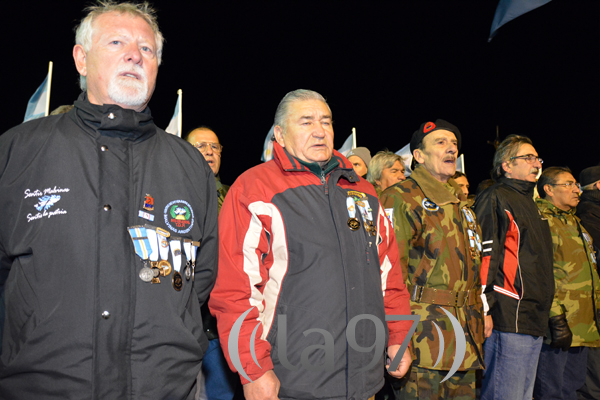 La vigilia comenzó a la medianoche con el izado de la bandera y la entonación del Himno Nacional cantado por el tenor veterano de guerra Juan Volonté.