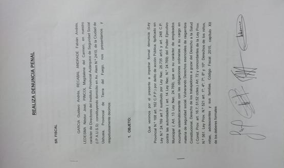 Esta mañana, la mayoría automática del Directorio del IPAUSS, integrada por Ledesma, García, Pincol y Recabal, presentó una denuncia penal contra el Municipio de Río Grande por incumplimientos en cuanto al pago de la deuda que mantiene el Ejecutivo local con el Instituto.