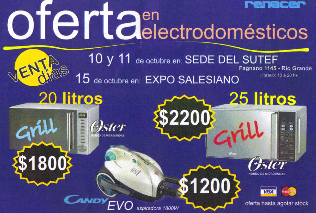 Aspiradoras y hornos microondas que se fabrican en la planta de Renacer en Ushuaia se ofrecen a modo de venta al público durante dos días de esta semana en Río Grande, a precios muy rebajados respecto de su cotización en plaza.