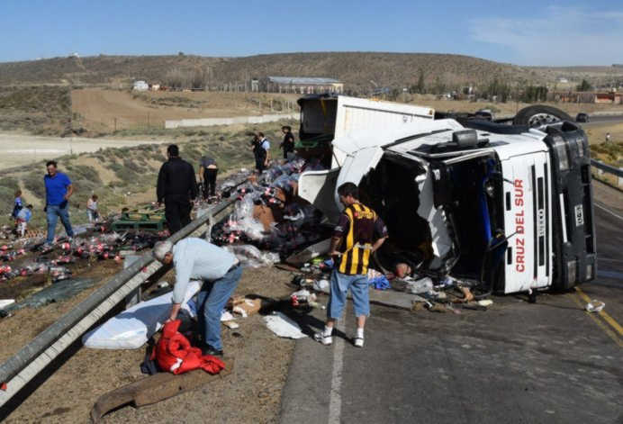 Las fuertes ráfagas y una imprudente velocidad en un tramo de curva cerrada de la Ruta 3, inmediatamente al sur de ejido urbano de Caleta Olivia, habrían sido las causas del vuelco de un camión que transportaba 24 toneladas de gaseosas.