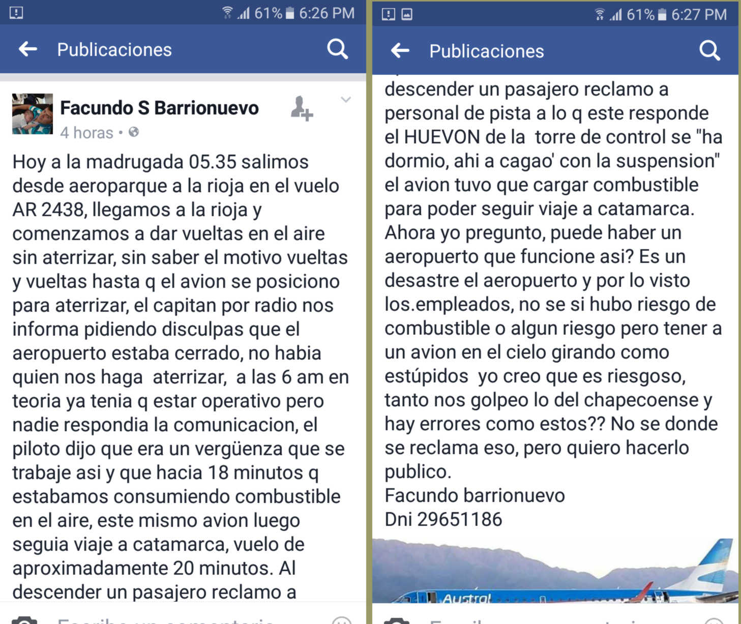 De acuerdo con la crónica que el pasajero Facundo Barrionuevo posteó en Facebook, uno de los viajeros le preguntó al personal de pista que había pasado, recibiendo como respuesta: «El huevón de la torre se ha dormido».