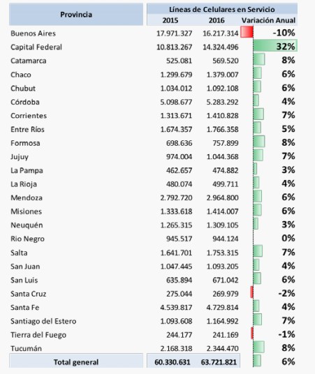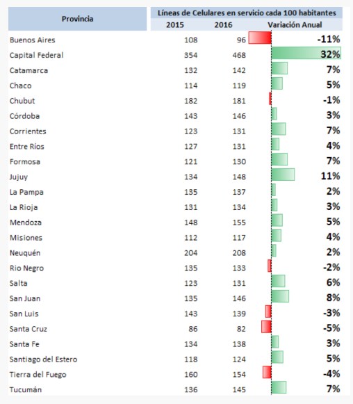 En el caso de nuestra provincia, la variación fue de apenas -1%, pasando de 244.177 líneas de telefonía celular activas en 2016 a 241.169 en 2017.