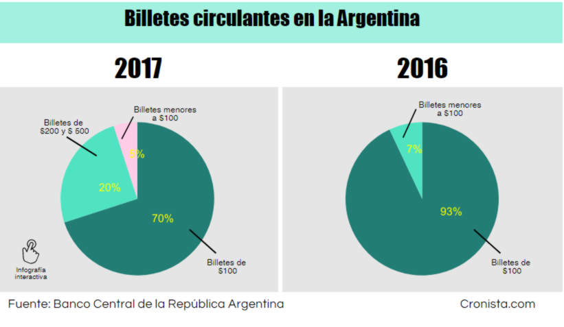 Un 70% de los billetes circulantes son de $ 100 pesos y apenas 5% está en papel moneda de menor valor, en denominaciones de $ 5; $ 10; $ 20 y $ 50. En la actualidad, el 25% del efectivo en poder de los argentinos está físicamente en los nuevos billetes de $ 200 y $ 500, según los datos del BCRA.