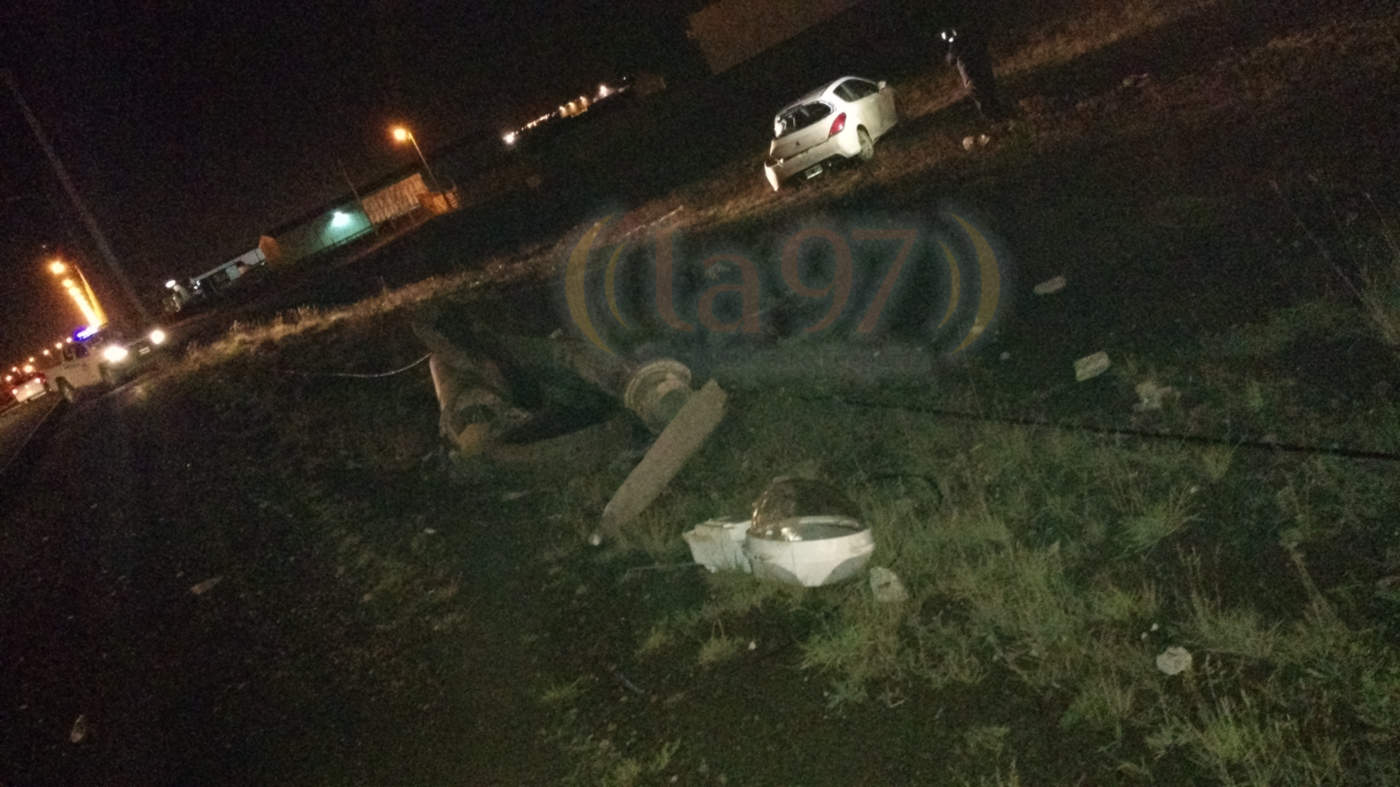 Una columna de cemento derrumbada, daños cuantiosos en el rodado y dos personas hospitalizadas fue el saldo de un despiste ocurrido anoche en el kilómetro 2825 de la ruta 3, frente al autódromo de Río Grande.