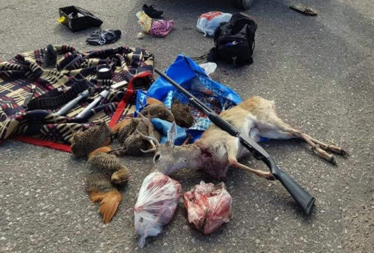 Ante la actuación policial, los ocupantes del auto arrojaron un bulto que contenía animales faenados y un arma de fuego que ocultaban en el motor del vehículo, en el que viajaban tres hombres oriundos de la ciudad cordobesa de Marcos Juárez.