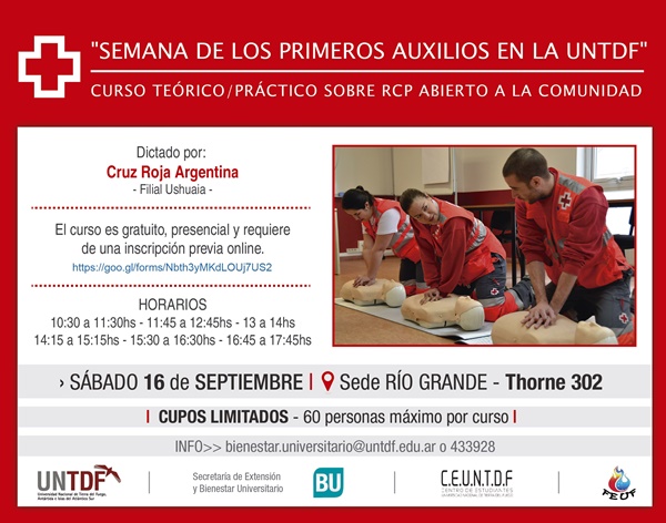 La Universidad Nacional de Tierra del Fuego (UNTDF) junto a la Cruz Roja Argentina llevarán a cabo un curso de Reanimación Cardio Pulmonar (RCP) el próximo sábado 16 de septiembre en la UNTDF de Río Grande. La capacitación se replicará debido a la gran cantidad de inscriptos hasta el momento.