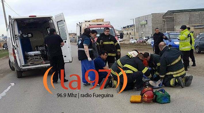 En la tarde de hoy, un violento accidente de tránsito entre una moto y un vehículo tuvo lugar en la intersección de la calle Simón Bolívar y la ruta que lleva al Aeropuerto Internacional Río Grande, frente al Grande Hotel.
