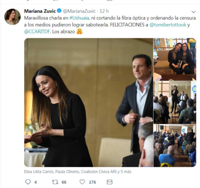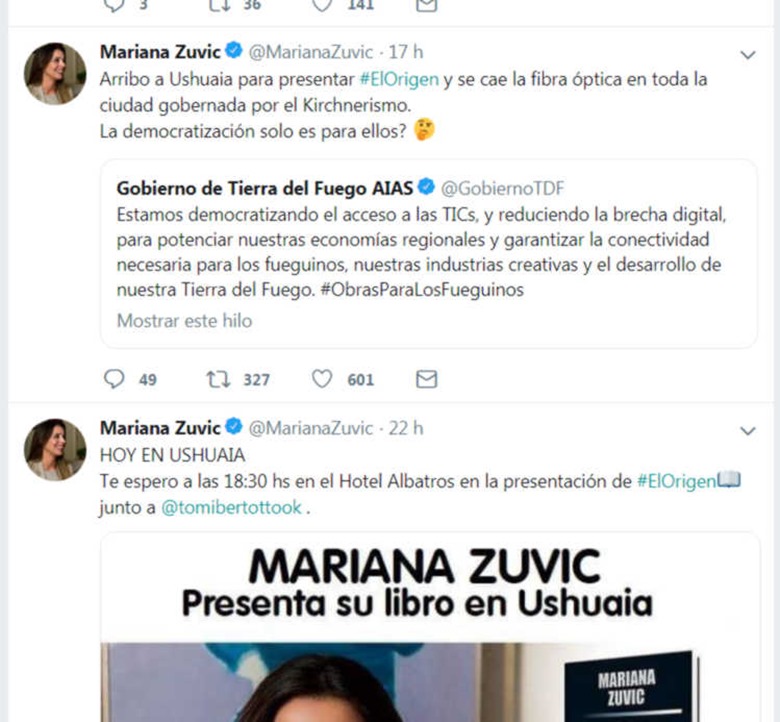En otro posteo, la parlamentaria le ponía destinatario concreto a sus acusaciones, al escribir que “Arribo a Ushuaia para presentar #ElOrigen y se cae la fibra óptica en toda la ciudad gobernada por el kirchnerismo”.