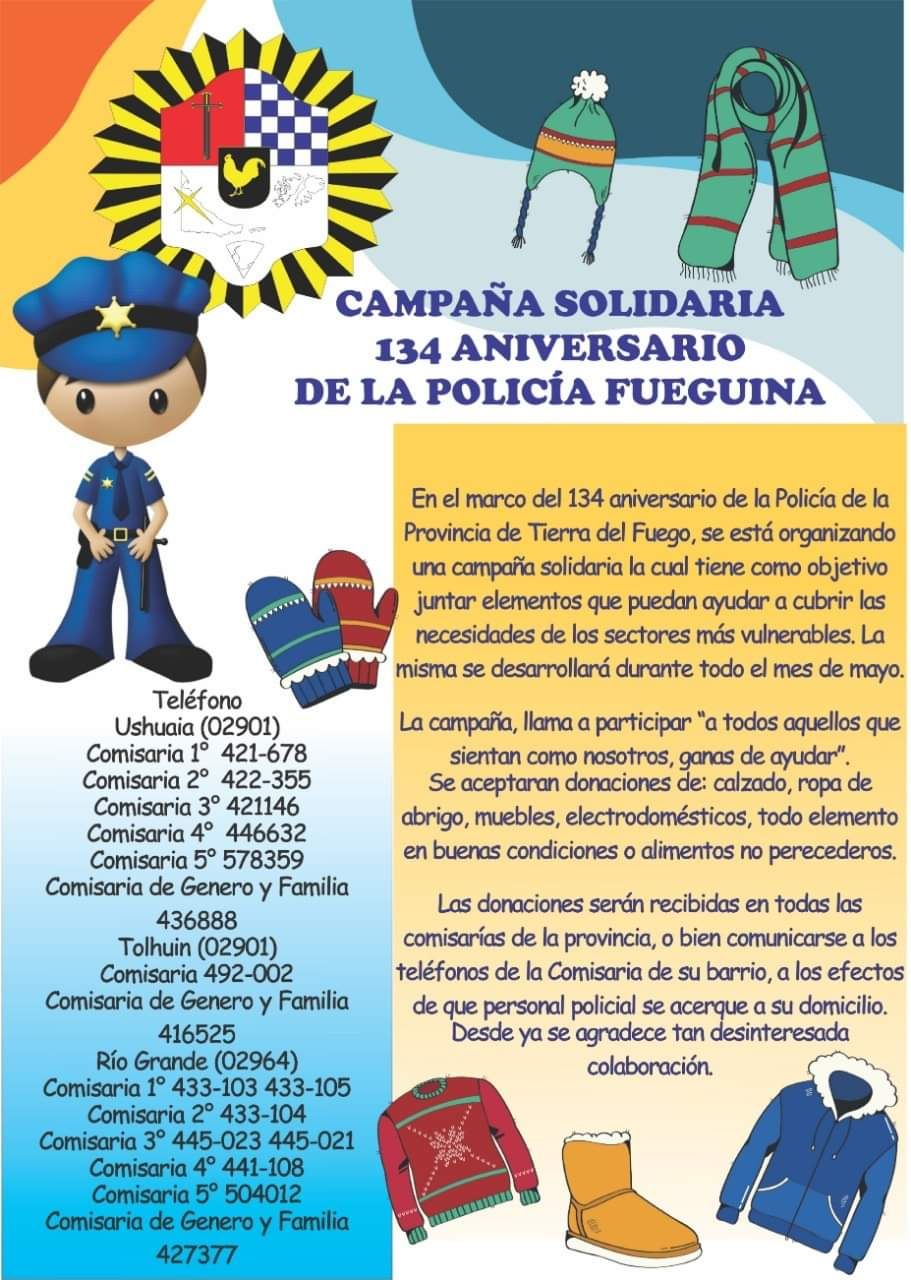 La Policía de la provincia de Tierra del Fuego, en el marco de su aniversario número 134, ha comenzado una nueva campaña solidaria para juntar elementos «que puedan cubrir las necesidad de los sectores más vulnerables».