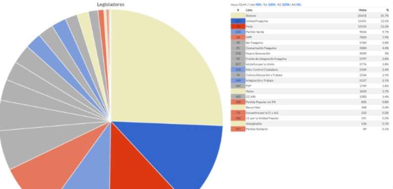 Los números provisorios indican (provisionalmente) que el Frente para la Victoria perderá no menos de 4 bancas de las que ganó en 2015, quedándose (ahora bajo la denominación de Unidad Fueguina) con cuatro, al igual que Forja. Dos escaños cada uno tendrían el Movimiento Popular Fueguino y Ser Fueguinos (ambos pierden una banca); el partido Verde se quedaría con 3 lugares.
