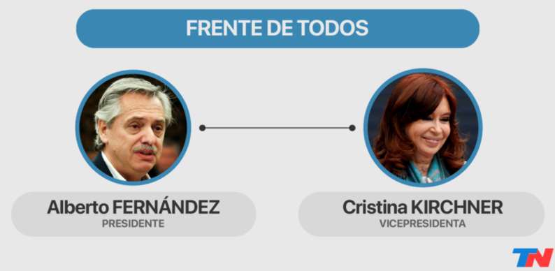 Los nombres son los de Mauricio Macri-Miguel Ángel Pichetto (Juntos por el Cambio), Alberto Fernández-Cristina Fernández de Kirchner (Frente de Todos), Roberto Lavagna-Juan Manuel Urtubey (Consenso Federal), José Luis Espert-Luis Rosales (Frente Despertar), Nicolás del Caño-Romina del Plá (FIT Unidad), Manuela Castañeira-Eduardo Mulhall (Nuevo Más), Juan José Gómez Centurión-Paola Miers (Alianza NOS) y Alejandro Biondini-Enrique Venturino (Frente Patriota).