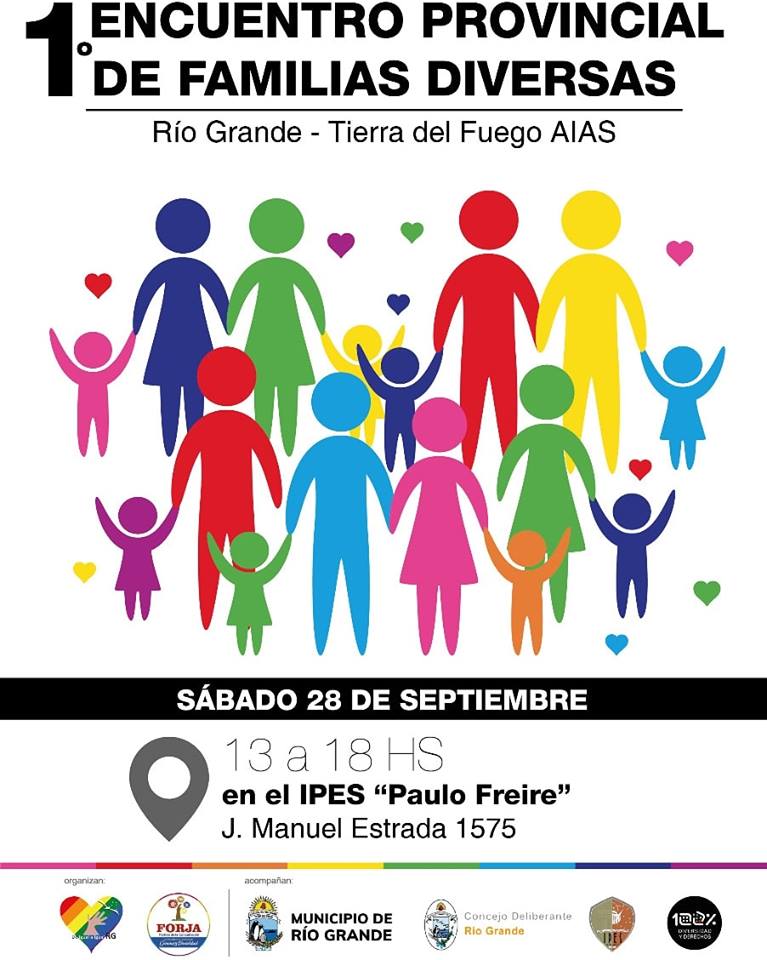 Este sábado 28 de septiembre de 13 a 18hs se llevará a cabo el 1° Encuentro Provincial de Familias Diversas en el IPES ‘Paulo Freire’ (Estrada 1575). El evento que es acompañado por el Municipio de Río Grande, lo desarrollará la organización ‘Igual a Igual’ junto a la Secretaría de Géneros y Diversidad de Forja Nacional por parte de la juventud.