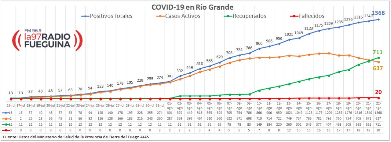 El Ministerio de Salud de la provincia de Tierra del Fuego informó, en la noche de este sábado y a través del nuevo parte epidemiológico, la situación general de nuestro distrito en torno al rebrote de coronavirus que se registra en Río Grande.