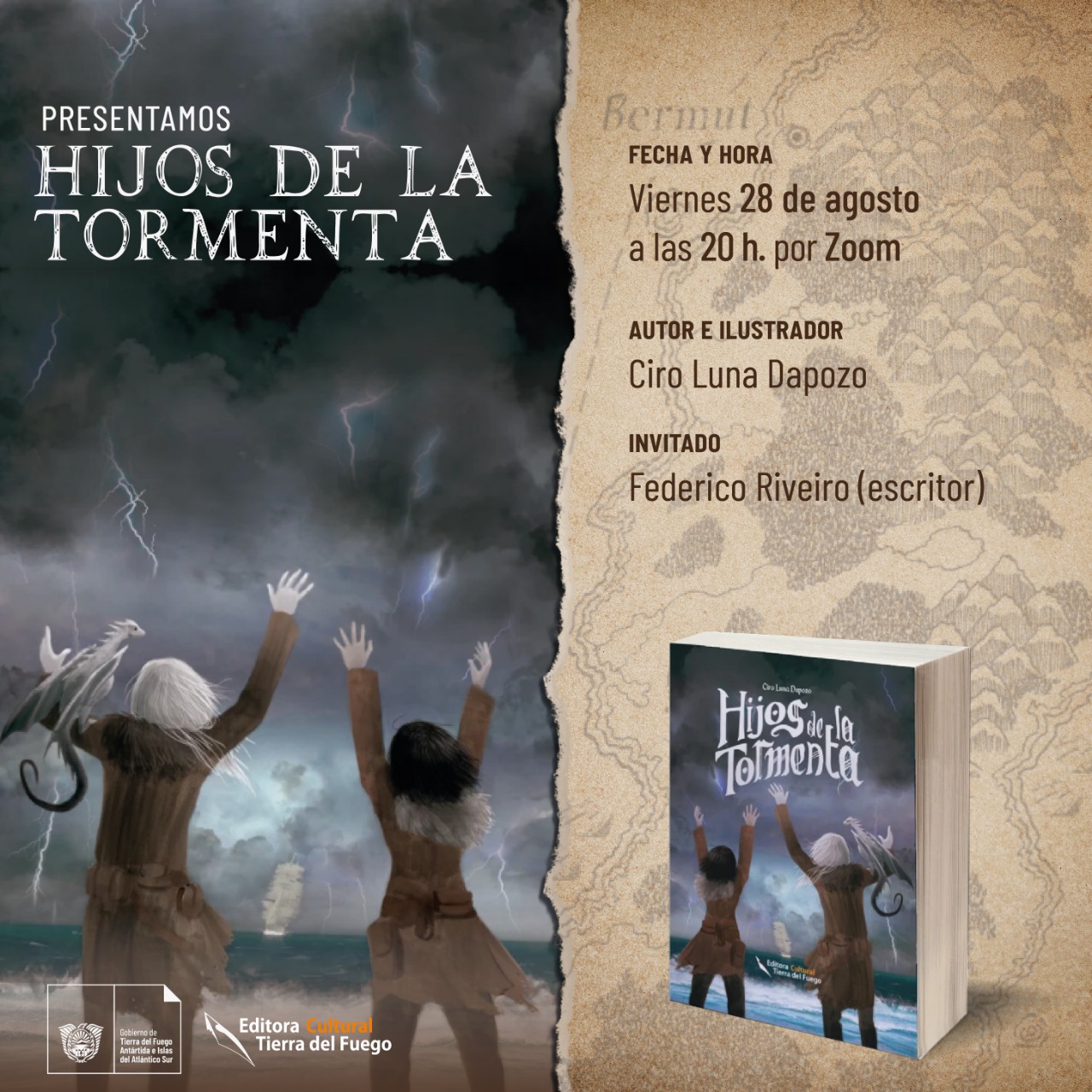 La Editora Cultural Tierra del Fuego presentará el libro “Hijos de la tormenta”, del escritor y dibujante de historieta Ciro Luna Dapozo, con ilustraciones del autor. Se contará con la participación, como invitado, del escritor argentino de cuentos y novela Federico Riveiro.