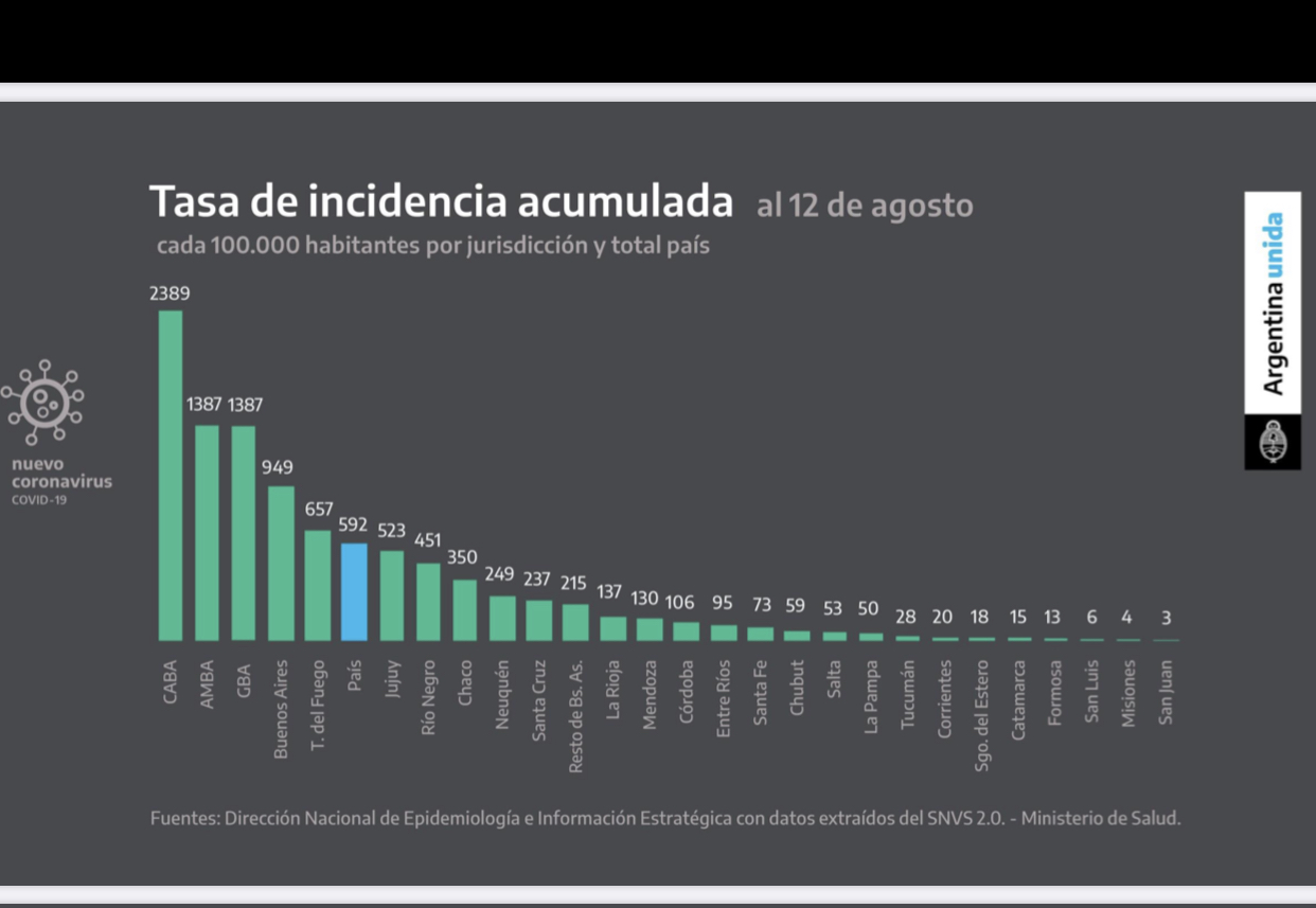 De acuerdo a los números mostrados este mediodía, si se deja de lado Buenos Aires, Tierra del Fuego es la provincia con más casos si se tiene en cuenta su población.