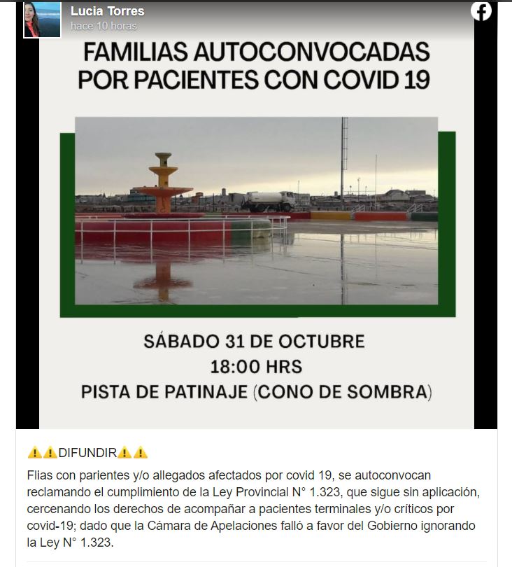 La convocatoria es realizada por familiares que no pueden acceder aún a visitar a sus seres queridos que se encuentran internados en grave estado con diagnóstico positivo para COVID-19.