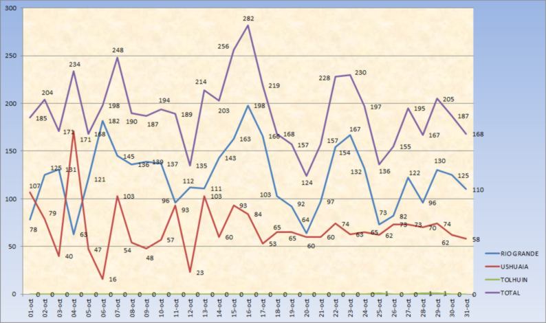 En total, a lo largo de octubre se confirmaron 5951 contagios, los cuales pertenecen 3793 a Río Grande, 2155 a Ushuaia y 3 a Tolhuin.