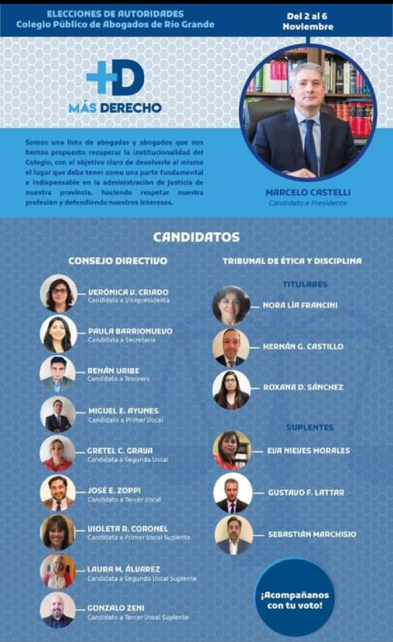 Así, el nuevo presidente del Colegio de Abogados de Río Grande será el Dr. Marcelo Castelli, secundado por la Dra. Vanesa Criado. Además, formarán parte de la composición del colegio los siguientes abogados: