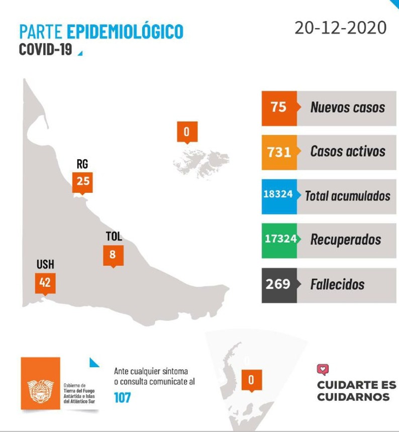 En Tolhuin se registran 124 casos totales por PCR. Se registra a la fecha 2 pacientes fallecidos.