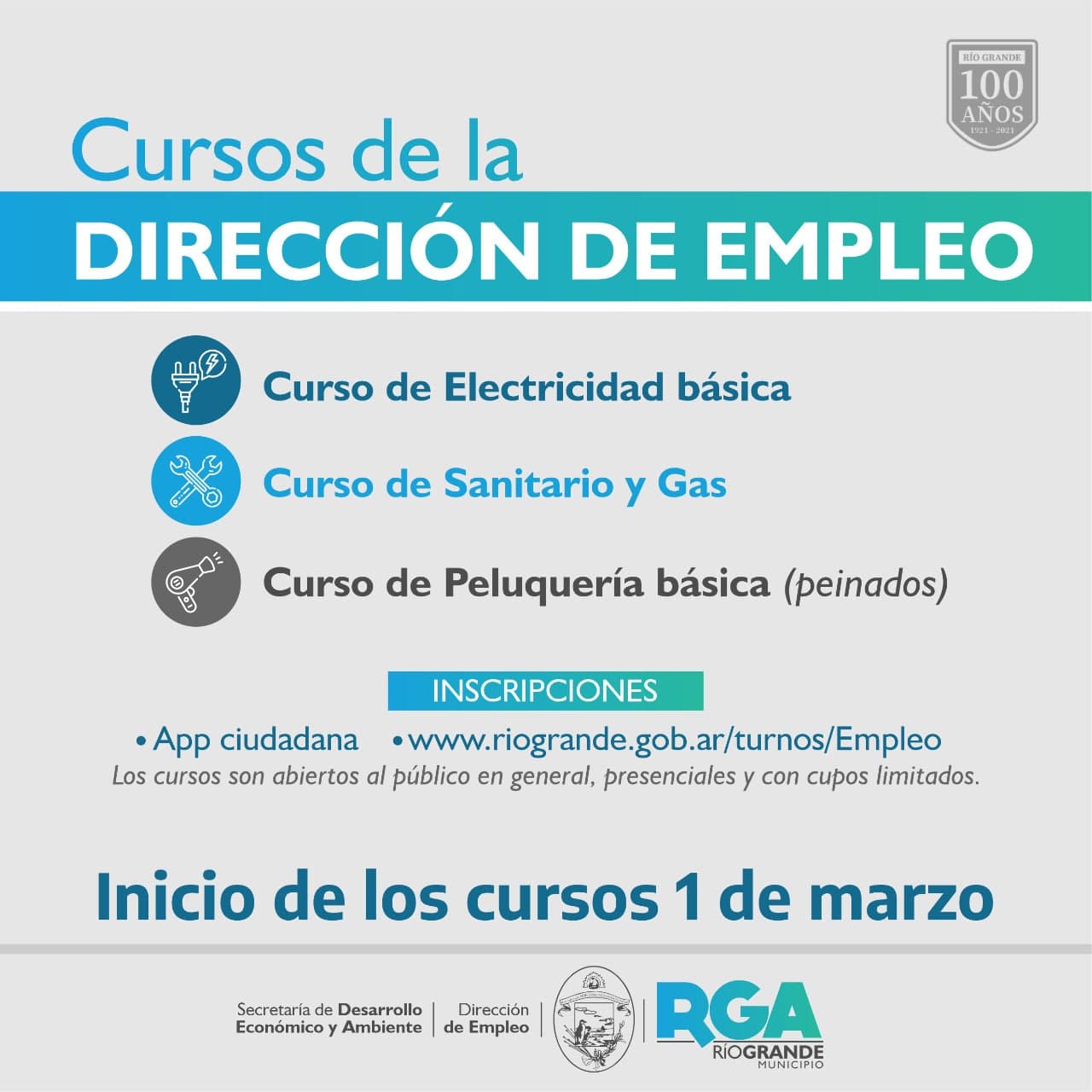 El Municipio de Río Grande informó que están abiertas las inscripciones para los cursos de electricidad básica, sanitario y gas, y peluquería básica. Son capacitaciones brindadas por la Dirección de Empleo, dependiente de la Secretaría de Desarrollo Económico y Ambiente.