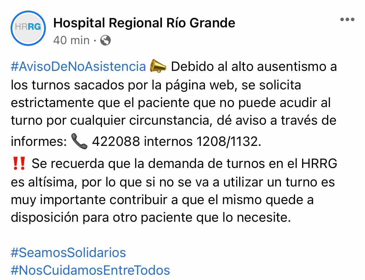 «Debido al alto ausentismo a los turnos sacados por la página web, se solicita estrictamente que el paciente que no pueda acudir al turno por cualquier circunstancia, dé aviso a través de informes: 422088 internos 1208/1132», indican.