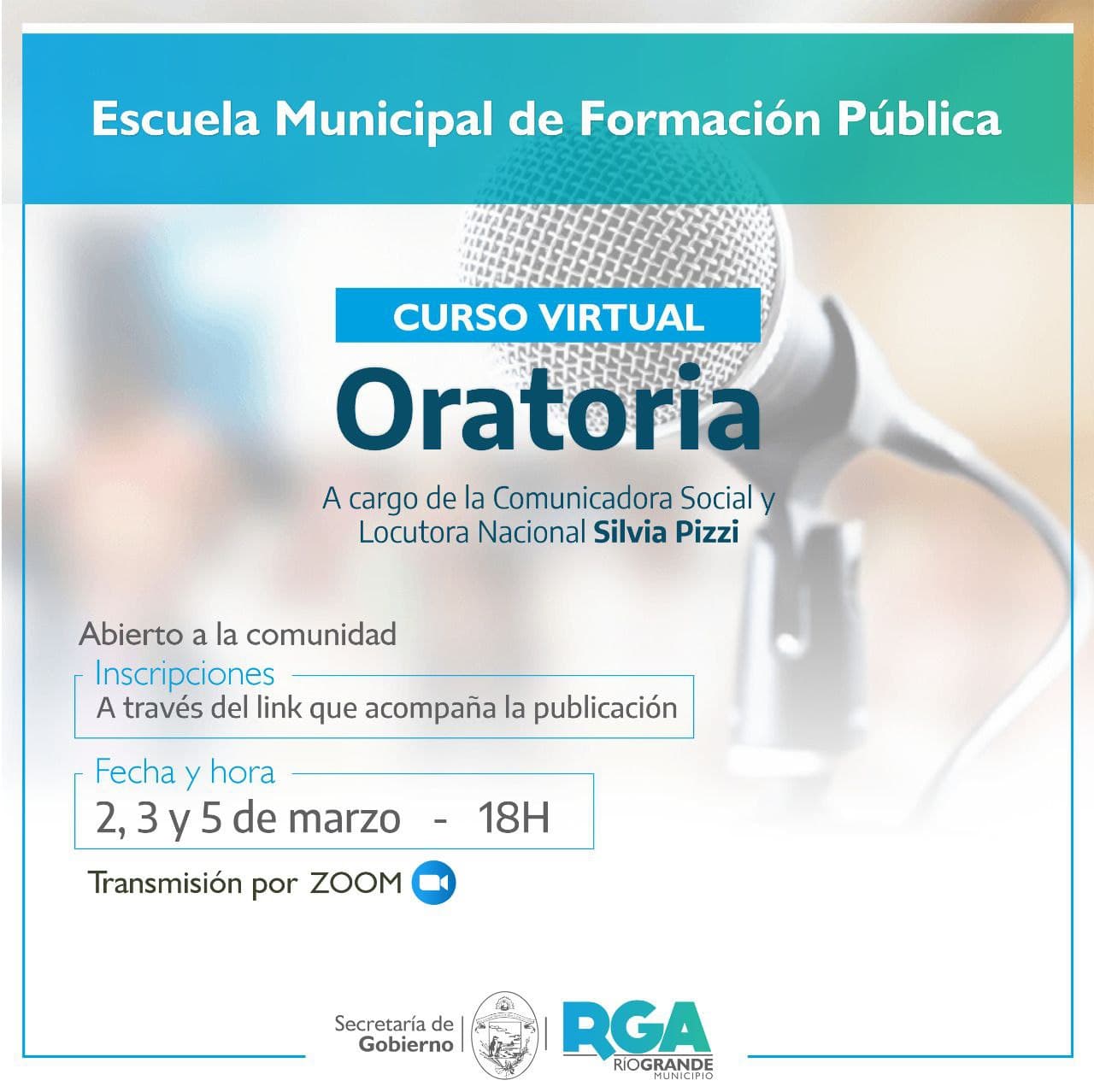 La Escuela Municipal de Formación Pública invita a la comunidad en general a participar del Curso Virtual de Oratoria, el cual se realizará los próximos 2, 3 y 5 de marzo desde las 18 horas a través de la Plataforma Zoom.