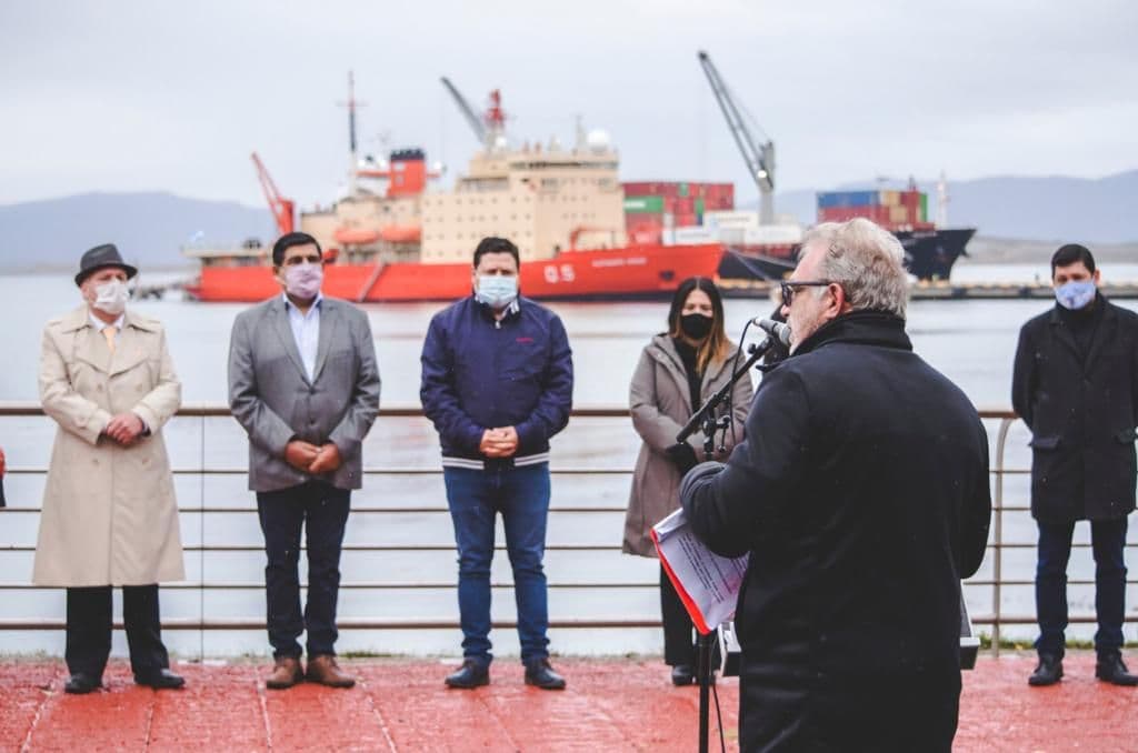 La semana de la Antártida concluyó con un acto protocolar en el Paseo de los Pioneros Fueguinos, con el rompehielos Almirante Irízar de fondo.