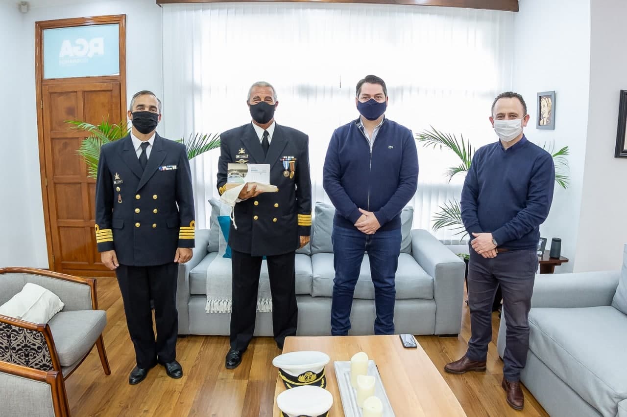 El intendente de Río Grande, Martín Pérez, junto al secretario de Gobierno, Gastón Díaz, recibió al comandante de la Fuerza de Infantería de Marina Austral, capitán de Navío Mario Alfredo Bilesio, y a su antecesor, el Capitán de Navío Gabriel Edgardo Terza.