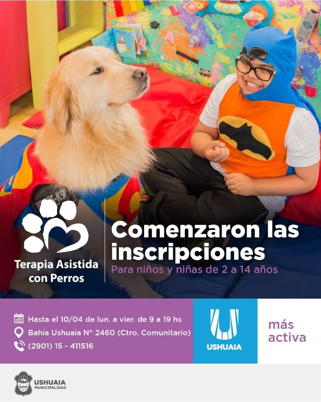 La Municipalidad de Ushuaia, por medio de la Secretaría de Políticas Sociales, informó que se encuentran abiertas las inscripciones para la Terapia asistida con Perros (TAP) para niños y niñas de 4 a 12 años con autismo y otros diagnósticos afines.
