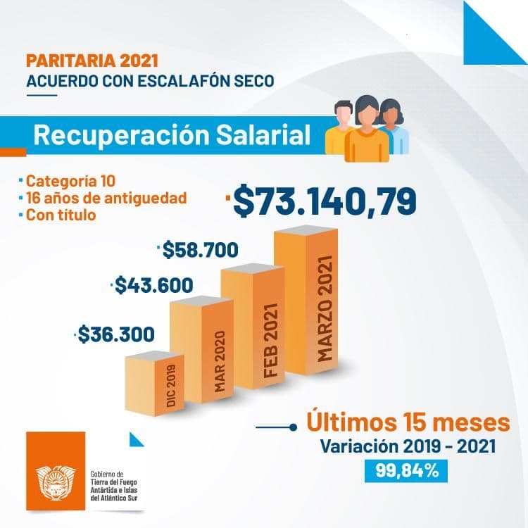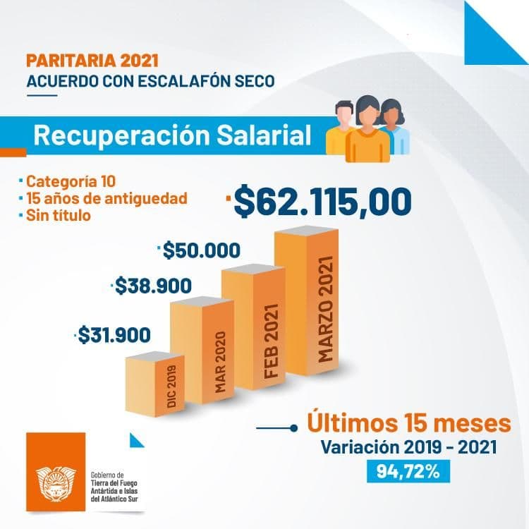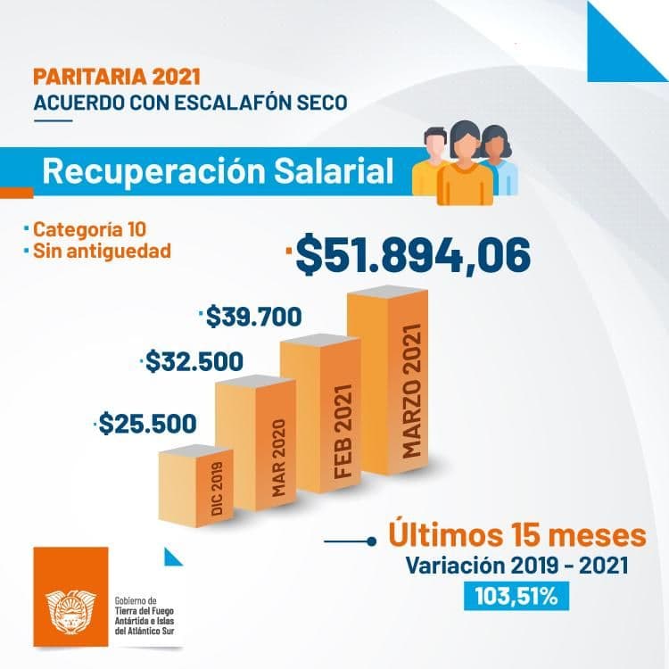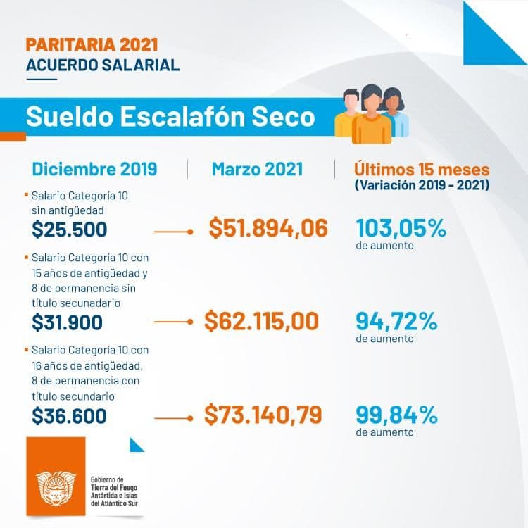 «Este acuerdo alcanzado con los gremios de ATE, ATSA y UPCN, ha significado un ordenamiento de la estructura del salario al absorberse ítems como el Decreto 2118 y el incremento unilateral dado por decreto por la gestión anterior, lo cual sumado a un incremento del 40% del salario básico fortalecido, establece a este último en $ 15.814 para una categoría 10, alcanzado el total de escala los $ 31.628», comunicaron las autoridades.