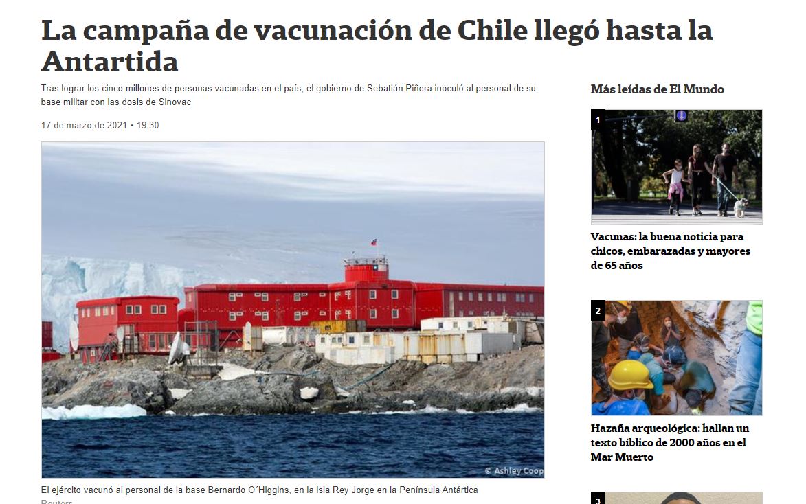 El pasado 17 de marzo, el diario La Nación publicaba en su edición digital una nota en la cual destacaba la decisión del Gobierno de Sebastián Piñera de comenzar a inmunizar contra el coronavirus no solo a su población del continente, sino también a aquellos trasandinos que se encuentran cumpliendo funciones en el continente antártico.