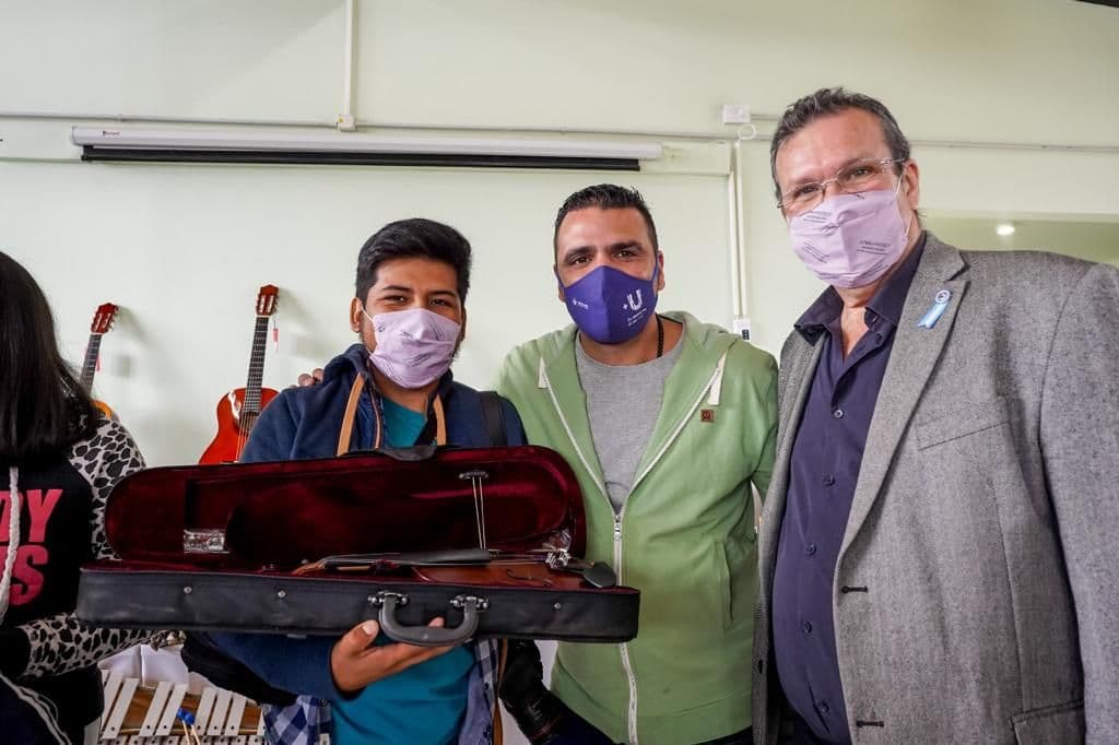 El intendente de Ushuaia, Walter Vuoto, hizo entrega de instrumentos musicales para la nueva orquesta infanto juvenil Mar de Fueguitos, conformada por niños y jóvenes del KyD. Estuvo acompañado por el ministro de Cultura de la Nación, Tristán Bauer, y la secretaria de Cultura y Educación municipal, María José Calderón.