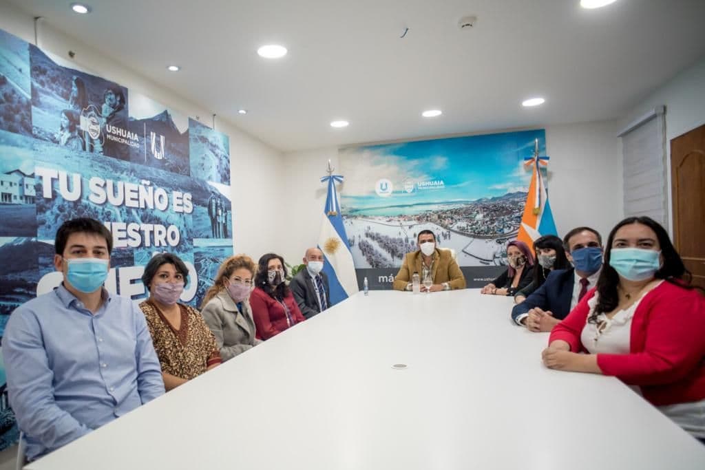 El intendente Walter Vuoto, acompañado de la secretaria de la Mujer, Noelia Trentino, y la coordinadora Legal, Administrativa y Técnica, Carolina Osta, recibió al rector de la Universidad de Tierra del Fuego AIAS (UNTDF).