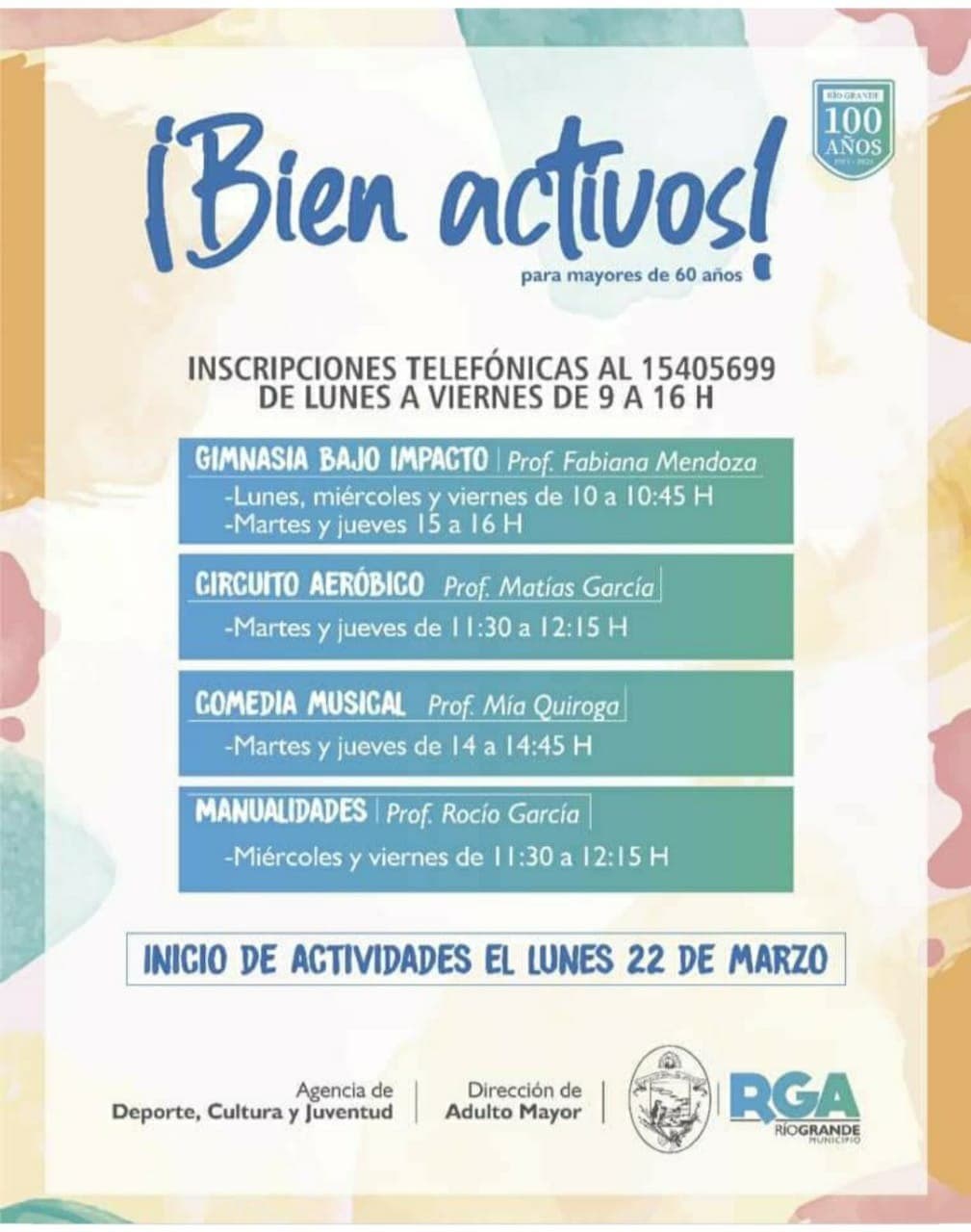 El Municipio de Río Grande, en conjunto con la Agencia de Deportes, Cultura y Juventud y la Dirección del Adulto Mayor, impulsa un nuevo programa dirigido a las personas mayores de 60 años denominado “¡Bien activos!”.