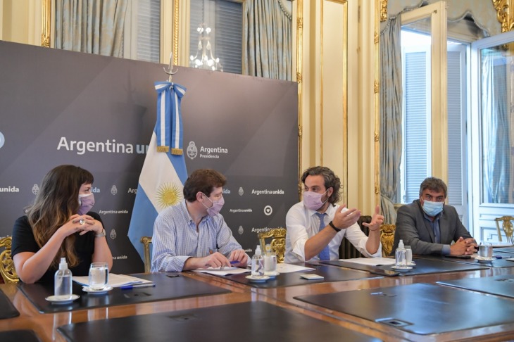 El presidente del Ente Nacional de Comunicaciones (ENACOM), Claudio Ambrosini, junto con el jefe de Gabinete de Ministros de la Nación, Santiago Cafiero, el gobernador de Tierra del Fuego, Gustavo Melella, el director de ARSAT, Néstor Pablo Tognetti, y la secretaria de Innovación Pública, Micaela Sánchez Malcolm, participaron de una reunión para coordinar la iniciativa que permitirá sumar la red de fibra óptica de la provincia a la red troncal de ARSAT, en el marco del Plan Conectar.