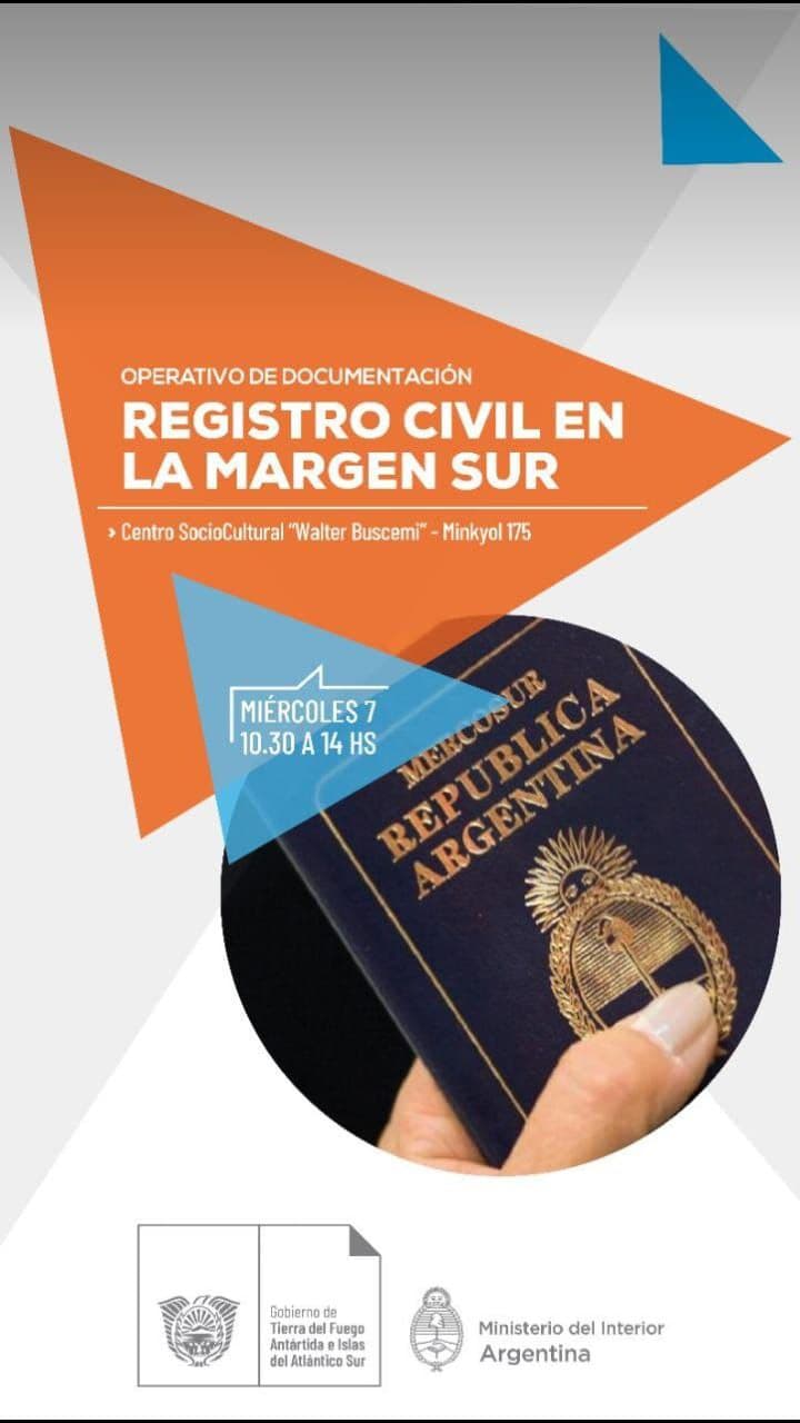 La Secretaría de Representación Política del Gobierno de Tierra del Fuego, en conjunto con la Secretaría de Justicia, realizará este miércoles 7 de abril de 10:30 14 horas un operativo de documentación en el Centro Socio Cultural Walter Buscemi de la Margen Sur en Río Grande.