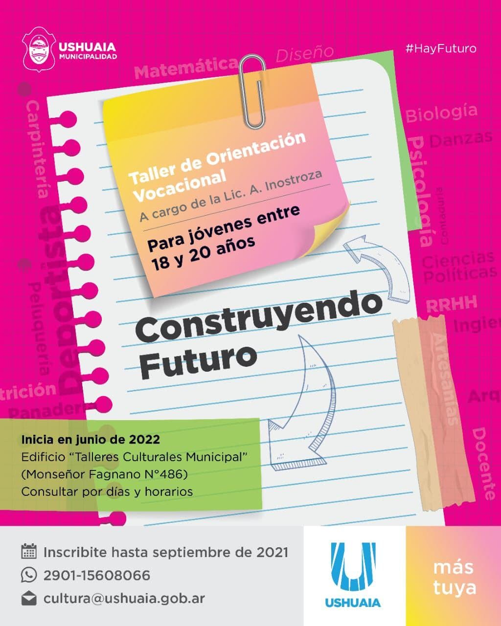 La Municipalidad de Ushuaia, a través de la Secretaría de Cultura y Educación informa el lanzamiento de los Talleres de Orientación Vocacional “Construyendo Futuro” a cargo de la Lic. Ayelen Inostroza, destinado a jóvenes entre 18 y 20 años.