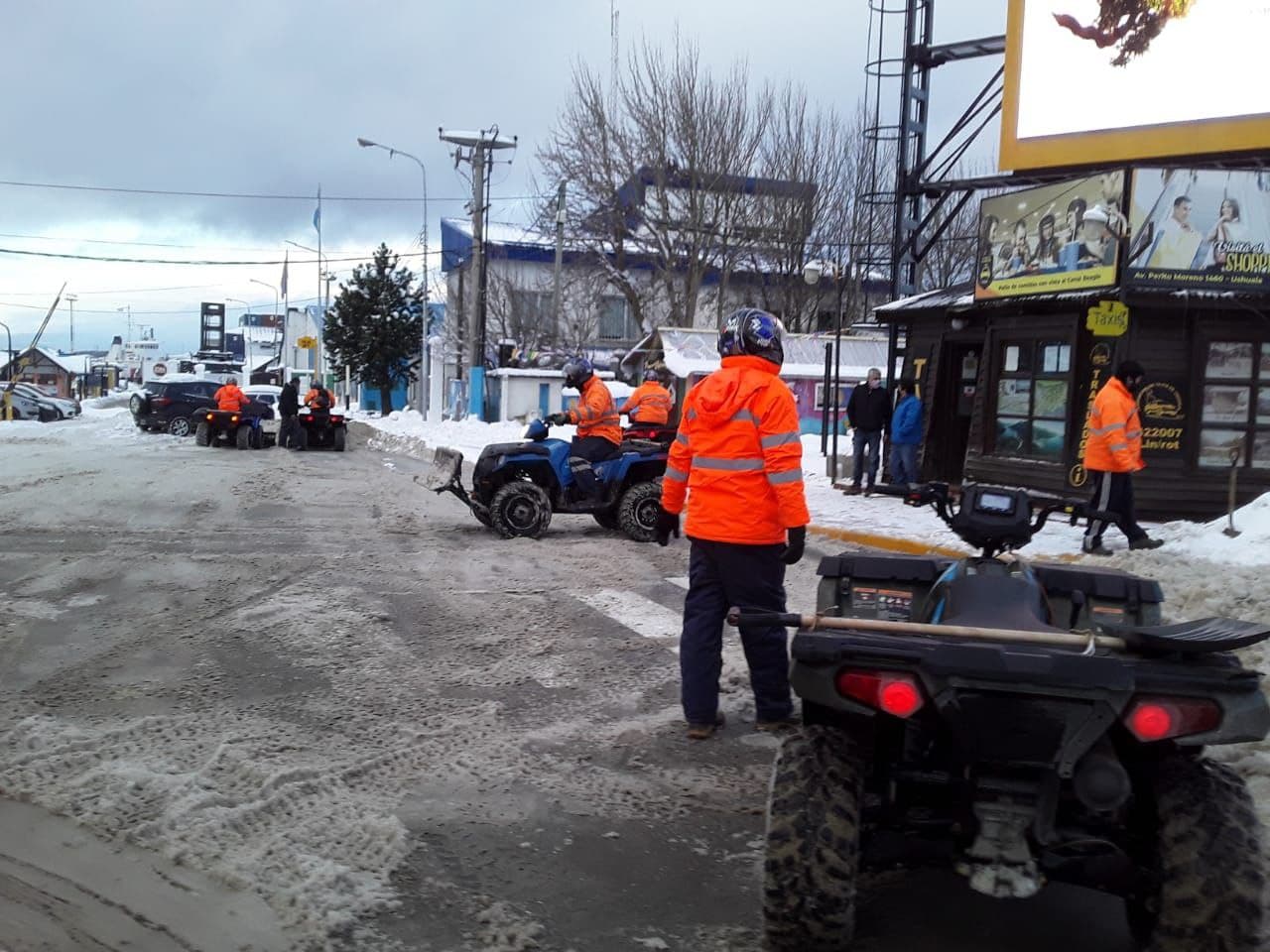 El secretario de Gobierno de la Municipalidad de Ushuaia, Pablo García, acompañó el trabajo de los cuatriciclos que forman parte de los equipos del Operativo Invierno encargados de la limpieza en la parada de taxis N°1 de la Asociación de Taxis, ubicada frente al puerto de la ciudad.