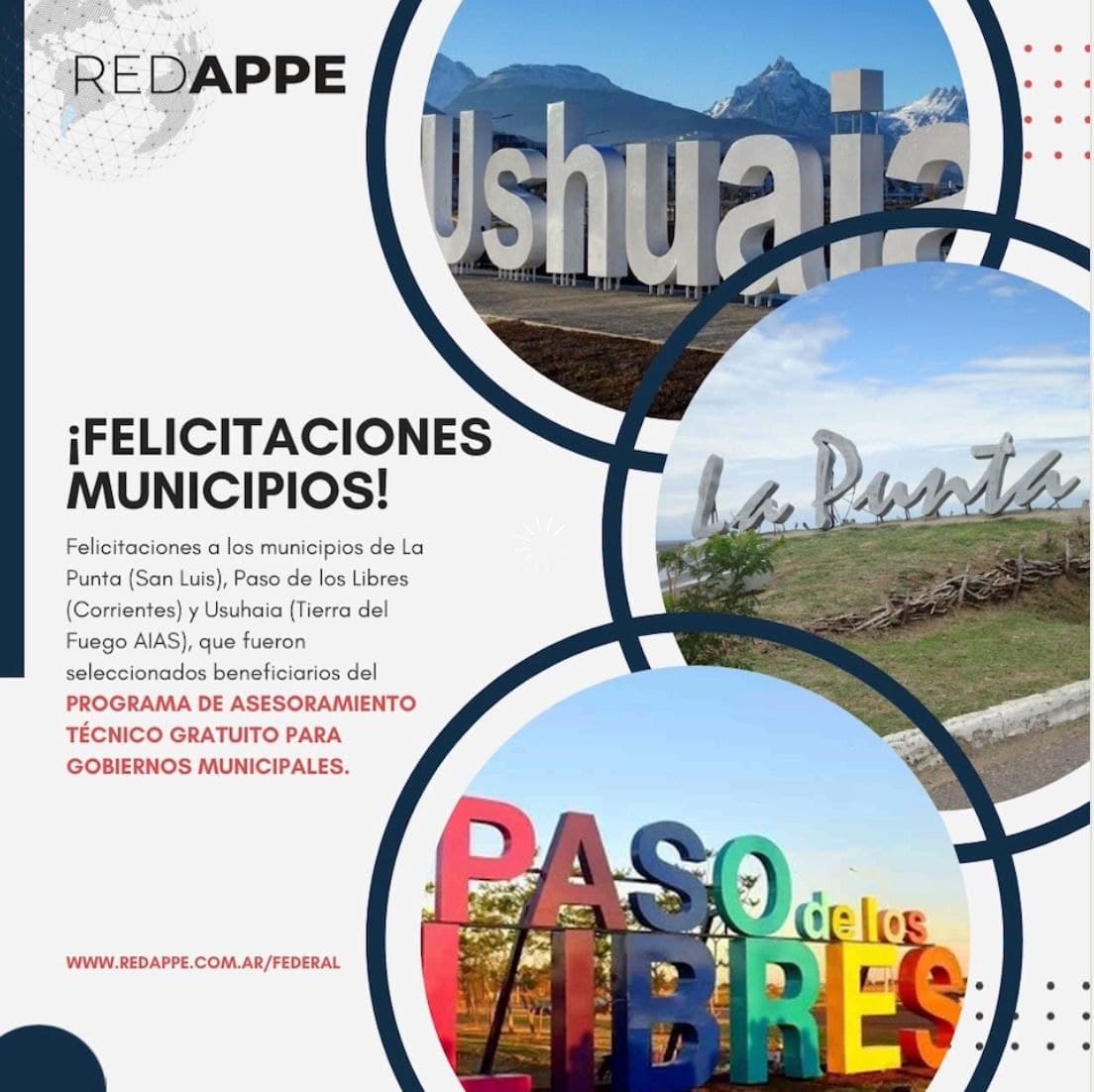 Los municipios de La Punta (San Luis), Paso de los Libres (Corrientes) y Ushuaia (Tierra del Fuego, Antártida e Islas del Atlántico) resultaron seleccionados tras una convocatoria federal que se llevó adelante el pasado mes de junio y abarcó todo el país.
