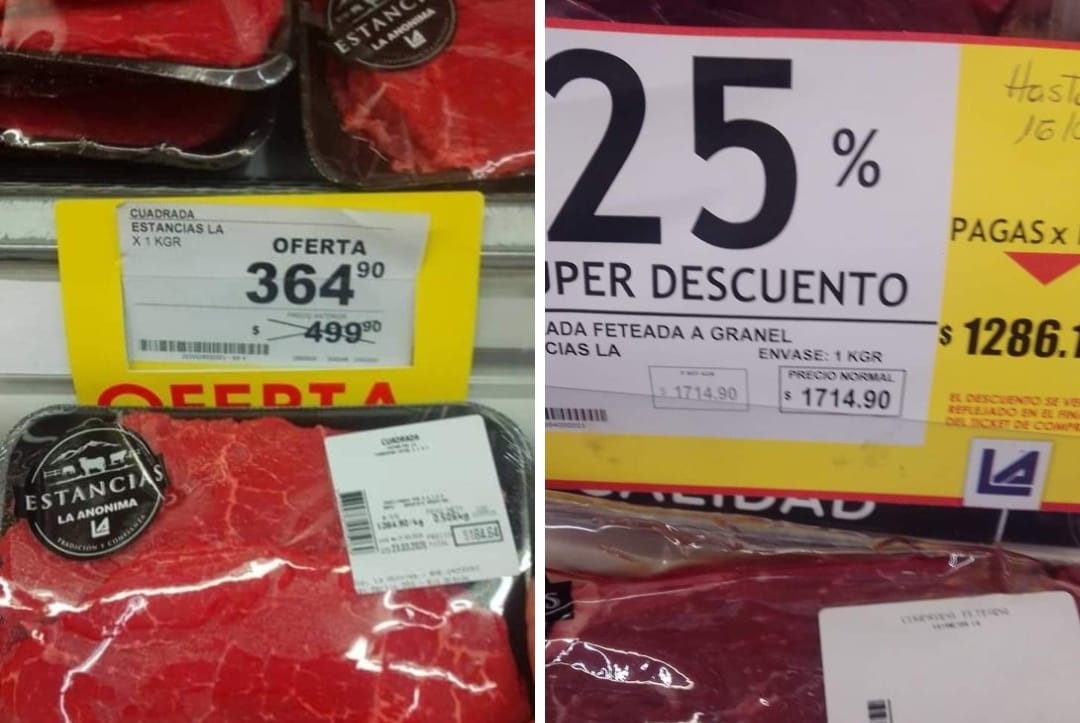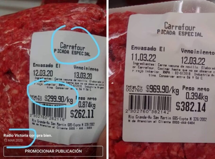 En el caso de la carne picada especial, llegó al supermercado Carrefour, que el 12 de marzo de 2020 la vendía a $299.90 y hoy lo hace a $969.90; con un aumento un 223%.