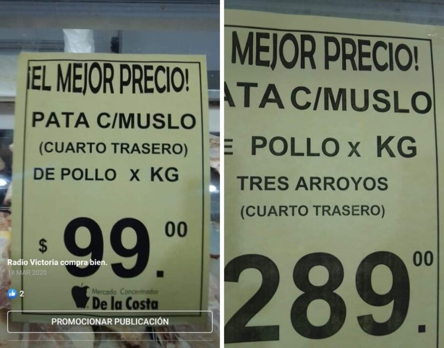El corte más popular de pollo, la pata con muslo, tuvo un incremento menor pero también marcado: con un 189%, pasó de $99 el kilo en 2020 a $289 en el Mercado de la Costa.