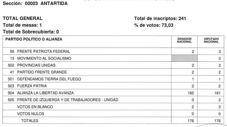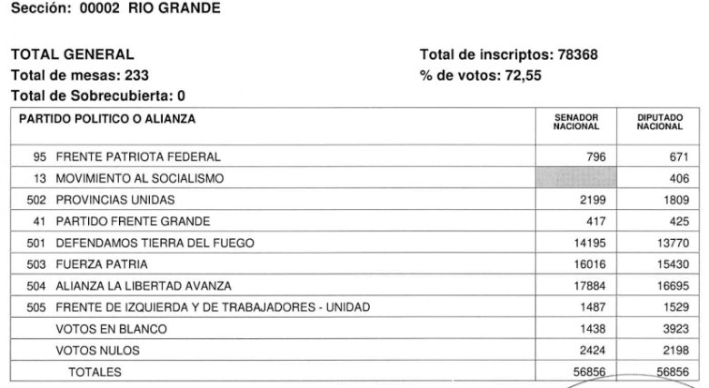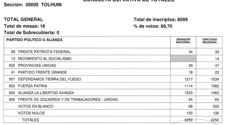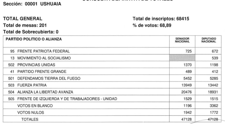 En el caso de Tierra del Fuego se informó que no ha habido cuestionamientos ni denuncias contra el acto comicial, por lo cual se difundió el escrutinio oficial definitivo y se confirmó la consagración de los nuevos legisladores que asumirán en sus bancas el próximo 10 de diciembre, en representación de la Provincia.