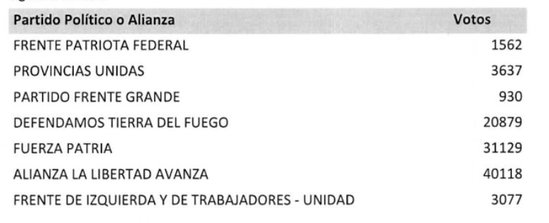 Como Diputados Nacionales por la Provincia de Tierra del Fuego, Antártida e Islas del Atlántico Sur, quedaron consagrados: por la lista nº 504 «La Libertad Avanza» RODRIGUEZ, Luis Miguel у por la lista nº 503 «Fuerza Patria» TITA, Paulo Agustin