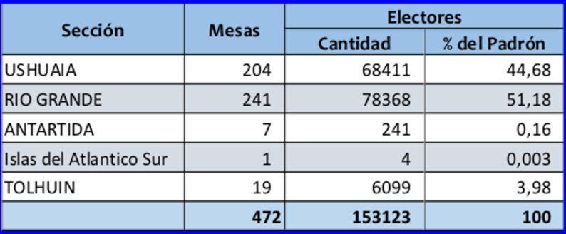 La distribución por secciones electorales muestra que Río Grande concentra la mayor cantidad de mesas (241) y un total de 78.368 votantes, seguida por Ushuaia con 68.411 electores distribuidos en 204 mesas.