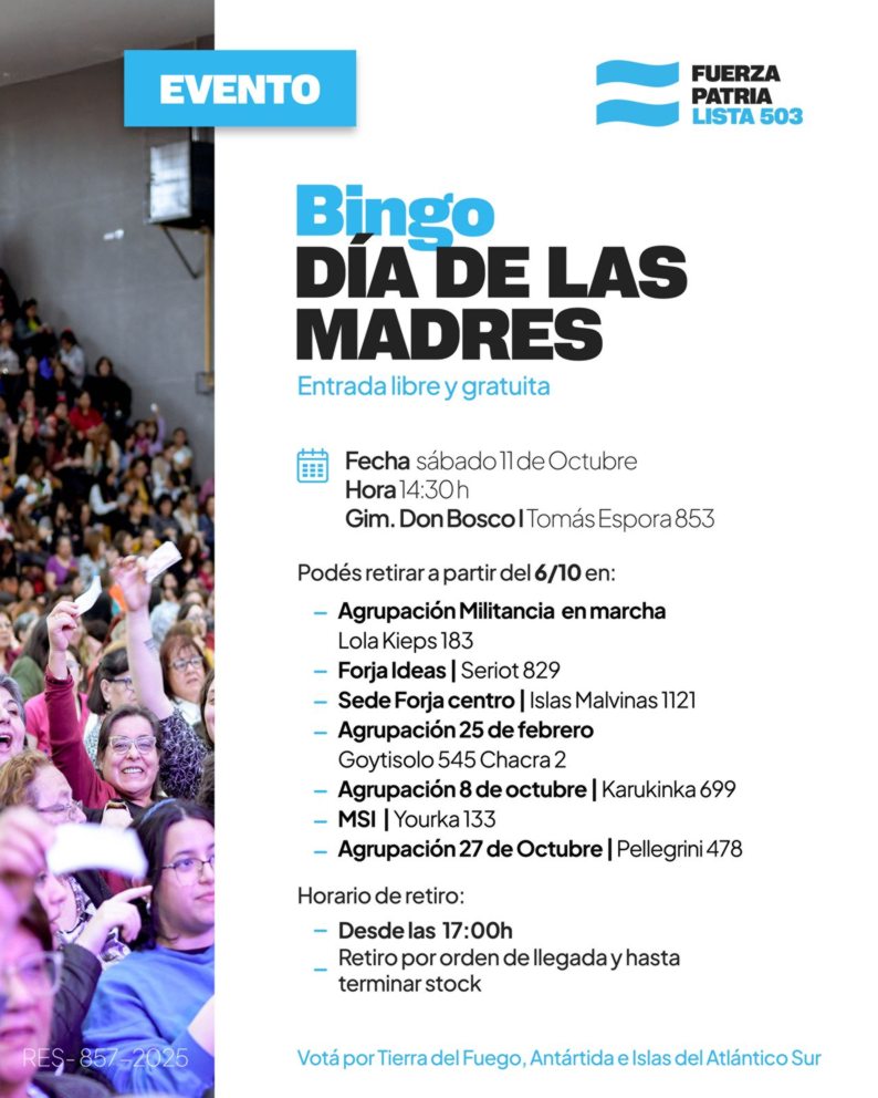 En el marco del Día de las Madres, el espacio Fuerza Patria llevará adelante una nueva edición del Gran Bingo del Día de las Madres, una propuesta gratuita que promete reunir a cientos de personas en una tarde de diversión, emoción y reconocimiento para todas las mamás.
