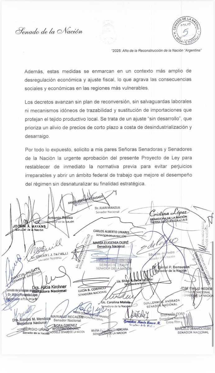 “Este proyecto es una respuesta de los senadores de todas las provincias argentinas. Es una muestra de que un bloque fuerte y unido puede ponerle un freno a Milei, cuando sus decisiones atentan contra la industria nacional, los trabajadores y las provincias”, sostuvo López.