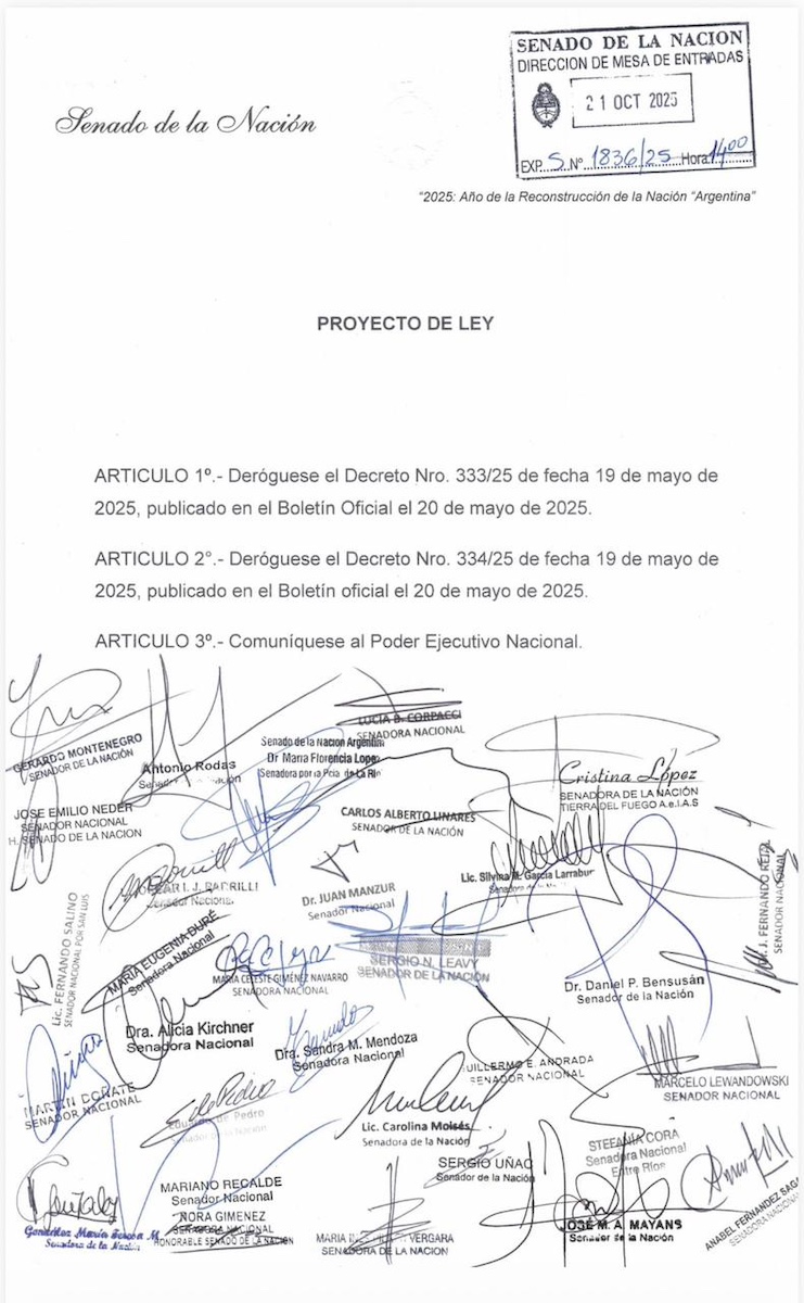 Los 34 senadores que integran la bancada firmaron de manera conjunta el proyecto de ley impulsado por la senadora fueguina, Cristina López, que propone la inmediata derogación de los Decretos 333 y 334 firmados por Javier Milei. La firma unánime de los 34 senadores es “otro límite a Milei frente al intento del Gobierno libertario de avanzar con el ajuste contra miles de trabajadores fueguinos”.